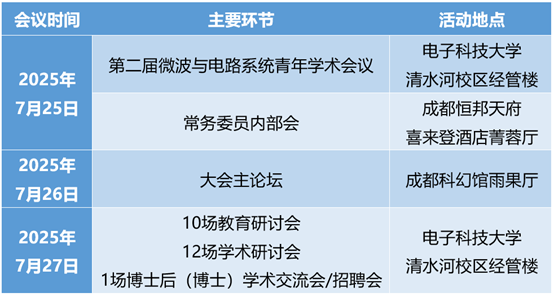 第十九届高校电子信息学院院长(系主任)年会暨第二届高校电子信息学科建设大会将于2025年7月25-27日在成都举办。大会包括1场主论坛,10场教育研讨会、12场学术研讨会、1场博士后(博士)学术交流会、招聘会,同期召开第二届微波与电路系统青年学术会议。